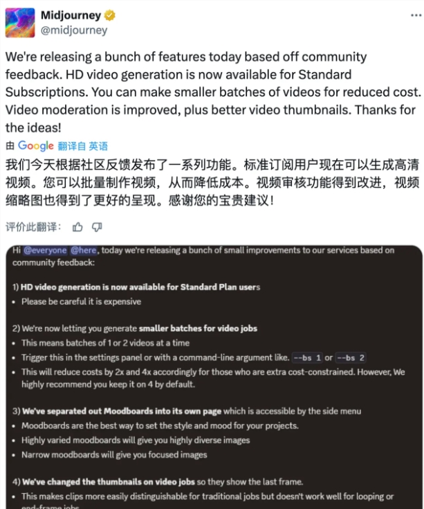 为了进一步提升用户体验,Midjourney对视频审核功能进行了优化。这意味着,用户在上传和生成视频内容时,审核的准确性得到了增强,确保生成的视频更符合社区的标准与期待。同时,视频作业的缩略图也进行了优化,用户在浏览视频时,可以更清楚地看到最后一帧的画面,这对于视频内容的选择和浏览大有裨益。这种对细节的关注,体现了 Midjourney以用户为中心的理念。